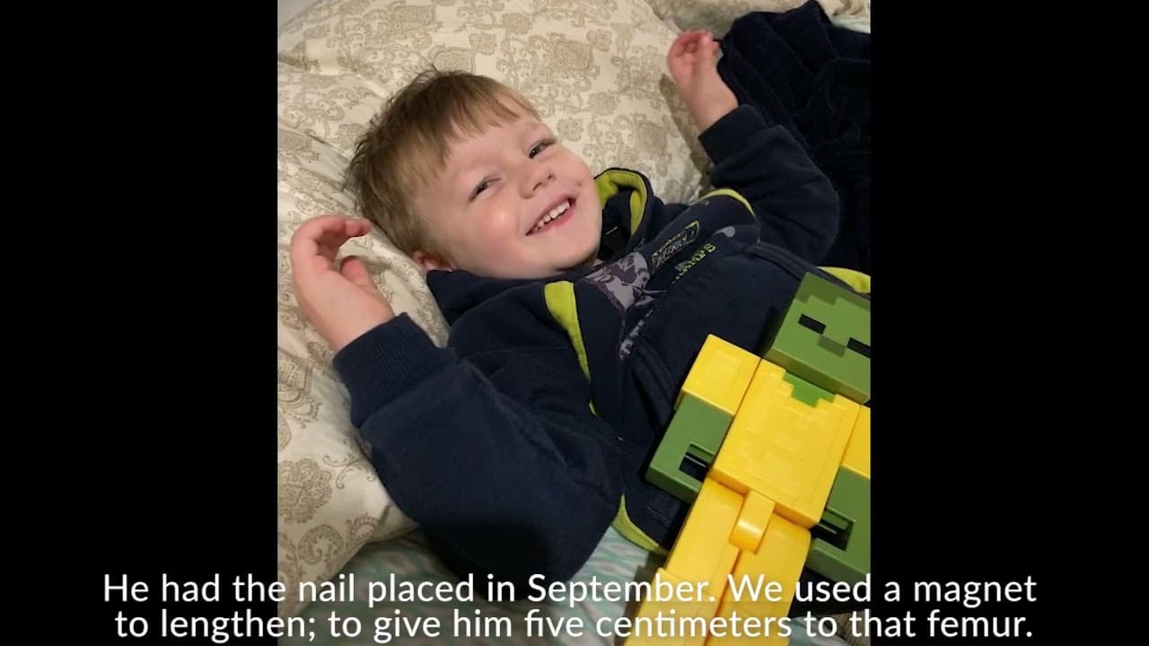 Speaker 1: Had the nail placed in September. We used a magnet to lengthen, to give him five centimeters to that femur. And that finished in October. It's going to stay in until the bone fills back in where that was separated. And then the screws, like the one that switched today is holding that nail to his femur.