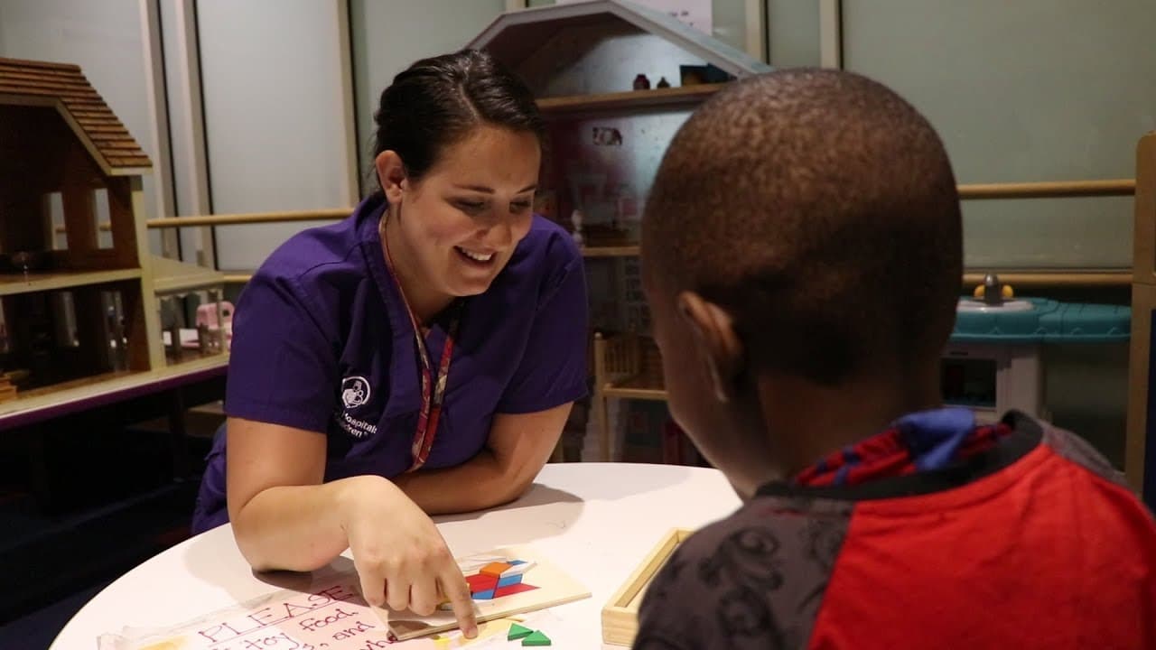 I would say that my favorite part of my job is that I'm able to bring play into a situation that you wouldn't ordinarily assume that there's play occurring. When you picture a child with a burn injury or an orthopedic injury, you don't picture them at bedside covered in Play-Doh or a finger painting on an easel that we've rigged above their hospital bed, but that's the type of play that we're doing every day and that's the type of creativity that we get to bring to this somewhat sterile medical environment.