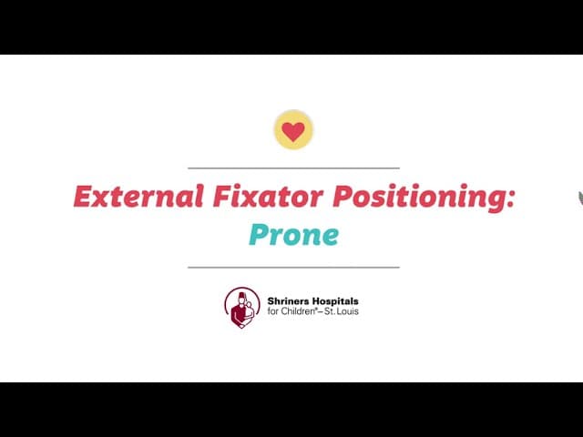 The prone position is performed to minimize tightness in the front of the hip and the back of the knee, as well as to alleviate pressure over the buttocks from prolonged sitting. Have your child roll from back to stomach while gently lifting the frame and following along. Once your child is on his stomach, gently lower the leg and position in alignment with his body. A pillow may be used under the knee to improve comfort. Some children prefer an additional pillow under the frame as well. This is fine as long as the knee is relatively straight. Make sure the hips are level and the leg is not rolled outward. This position should be maintained for 15 to 20 minutes, one to two times daily. Your child's PT will provide individualized instructions.