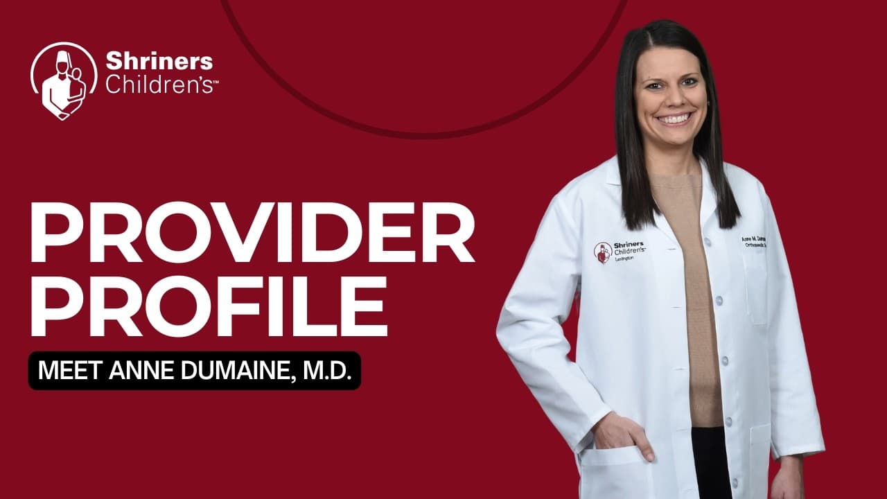 My name's Anne Marie Dumaine. I grew up in a small town in Northern Kentucky called California, Kentucky. And then through school made my way down to Lexington where I played soccer at Transylvania University. I did medical school at University of Cincinnati, moved a little further north to Cleveland at Case Western for my orthopedic residency and then ventured to Texas at Texas Scottish Rite for Children for my fellowship in pediatric orthopedics. And had rotated at Shriners as a medical student and loved the group here and always had it in my sights as the ideal place to end up back for for a job.