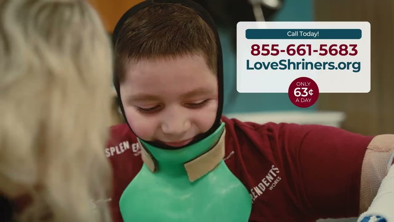 [Shriners Children’s donation screen displaying the message ‘Please call or go online now,’ the Shriners logo, phone number 855‑661‑5683, and website LoveShriners.org.]