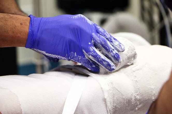 enyesado de Mehta. Una escayola cubre su torso desde las axilas hasta las caderas con un hueco para el vientre en la parte delantera y otro para las costillas en la parte trasera. Mediante la tracción y la presión, puede ayudar a enderezar la columna vertebral a medida que Clara crece.