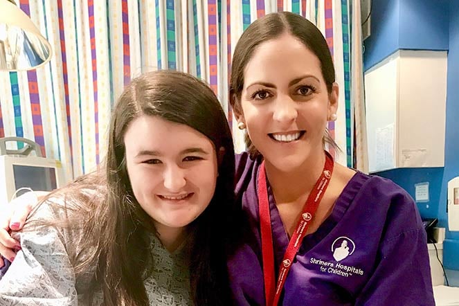 Bajo el cuidado de una cirujana especializada en quemaduras, la Dra. Colleen Ryan, Olivia se sometió a cirugías de injerto de piel para tratar las quemaduras de tercer grado en la espalda. Permaneció en el hospital durante casi un mes y recuerda lo increíble que fue el equipo de primera infancia. “Rebecca de desarrollo infantil era mi mejor amiga”, dijo Olivia. “Me llevó a la sala de juegos e hicimos manualidades juntas. Fue difícil estar en el hospital, pero casi me gustaba estar en Shriners. El personal me hizo sentir especial”.