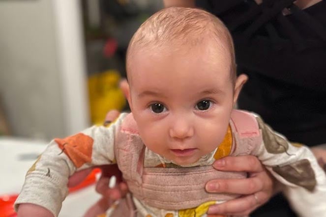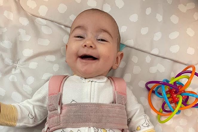 La primera cita de Aura en el Hospital Shriners para Niños Medford fue en julio de 2021. El personal les dio una calurosa bienvenida y conocieron al Dr. Hohl. En esa primera visita, el Dr. Hohl inmediatamente recomendó que Aura se colocara el arnés de Pavlik, un arnés de tela que mantiene sus caderas en la posición correcta para permitir que los huesos de la articulación de la cadera se desarrollen por completo.