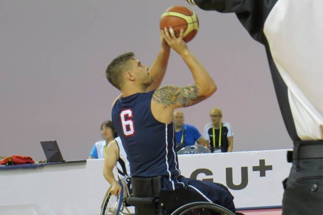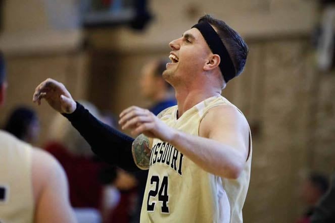 Carter luce con orgullo su camiseta de la Universidad de Misuri durante un partido de baloncesto en silla de ruedas.