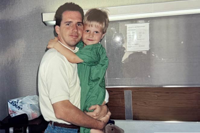 Carter le da un gran abrazo a su padre el día de la amputación. Los dos están parados en su habitación de paciente en el Hospital en St. Louis.