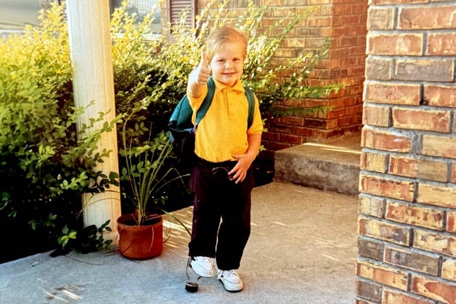 El pequeño Carter en su porche, ¡levantando bien alto el pulgar! Lleva con orgullo el dispositivo ortopédico para compensar la discrepancia en la longitud de sus extremidades.