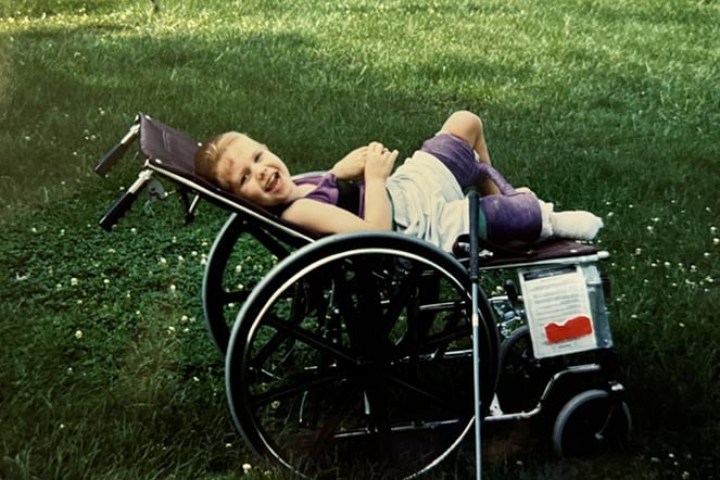 Con un yeso en el cuerpo, Carter sonríe cada día más, en silla de ruedas al aire libre después de la amputación.