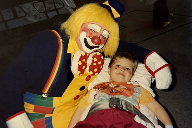 Carter es todo sonrisas, visitando a un payaso después de la cirugía en el Hospital Shriners para Niños St. Louis.