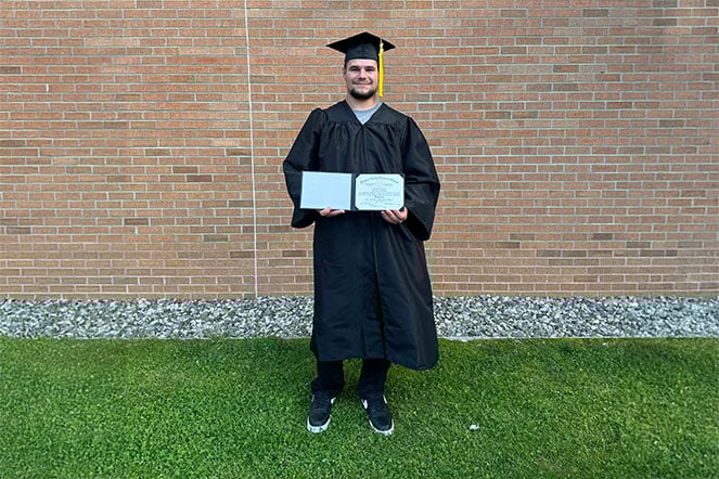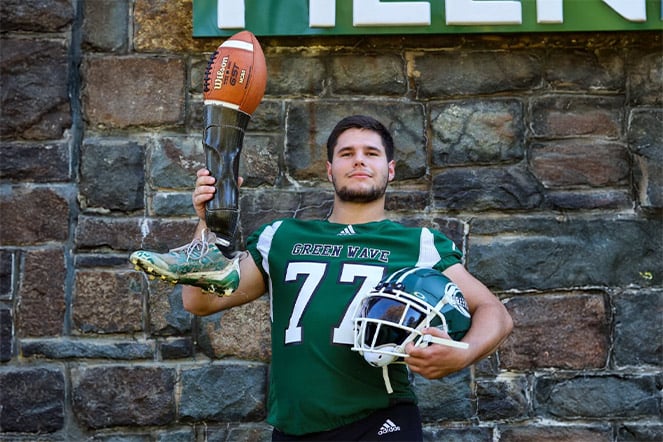 Con los años, el fútbol americano se convirtió en una pasión para Noah, y el equipo de Servicios Ortopédicos y Protésicos Pediátricos (POPS) de Shriners Children's trabajó con él para determinar qué prótesis podrían soportar el esfuerzo físico de este deporte. En la escuela secundaria, jugó como tackle ofensivo y defensivo. “Se necesita la fuerza del impulso de las piernas para mover a una persona que pesa 130 kilos”, explicó. “Una vez, me rompí la prótesis cuatro veces la misma semana, y el equipo POPS estuvo allí para arreglarla cada vez”.