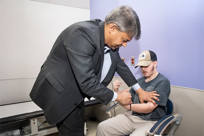 El Dr. Samdani comprueba los reflejos de Ethan en el bíceps y antebrazo durante su chequeo.