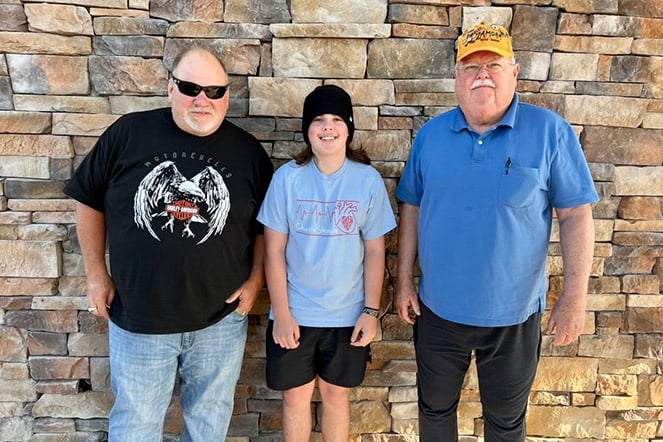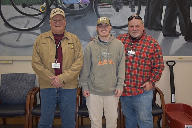 Ethan sonríe junto a sus conductores de los Shriners de Zamora en el vestíbulo del Hospital Shriners para Niños de Filadelfia antes de su viaje de regreso a Alabama más reciente.