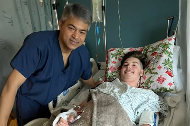 Ethan sonríe junto al Dr. Samdani después de su cirugía.