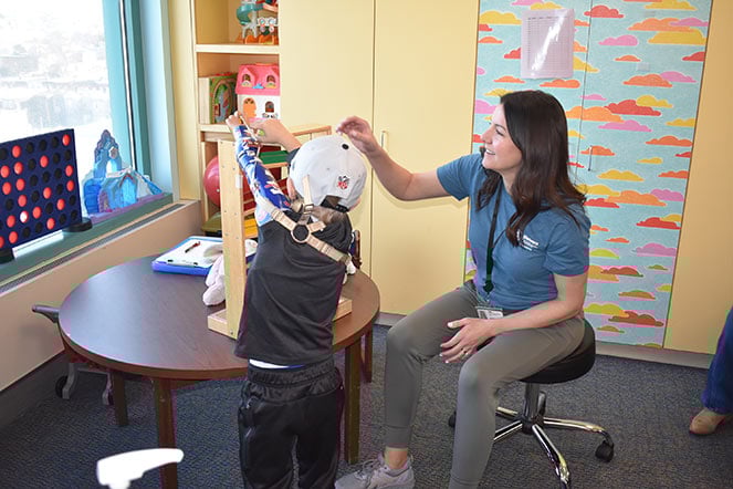 Además de las citas con el Dr. Zlotolow y el personal del departamento POPS, Jackson trabaja periódicamente con el equipo deergoterapia para garantizar el ajuste y el dominio de su brazo protésico.