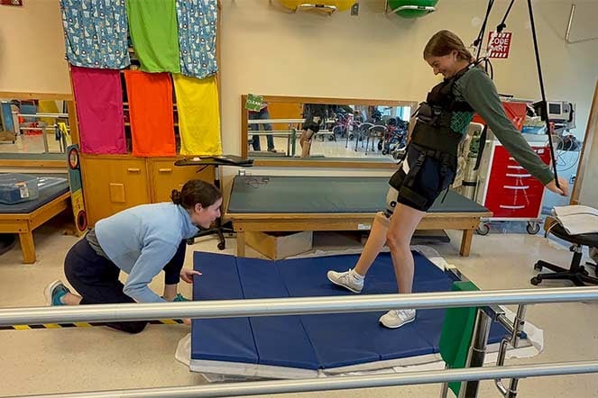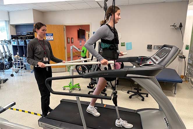 Sarah practices walking on a treadmill in physical therapy.