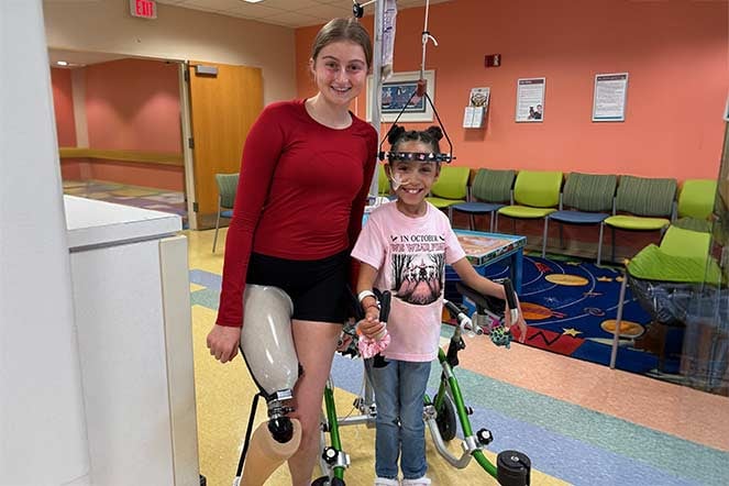 Sarah shares a moment with fellow patient Kenadi at Shriners Children’s Philadelphia.