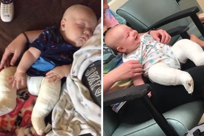 Plusieurs séries de plâtres ont étiré les jambes et les chevilles de Grayson pour qu'il soit prêt pour la chirurgie
