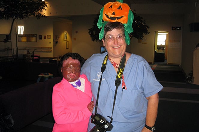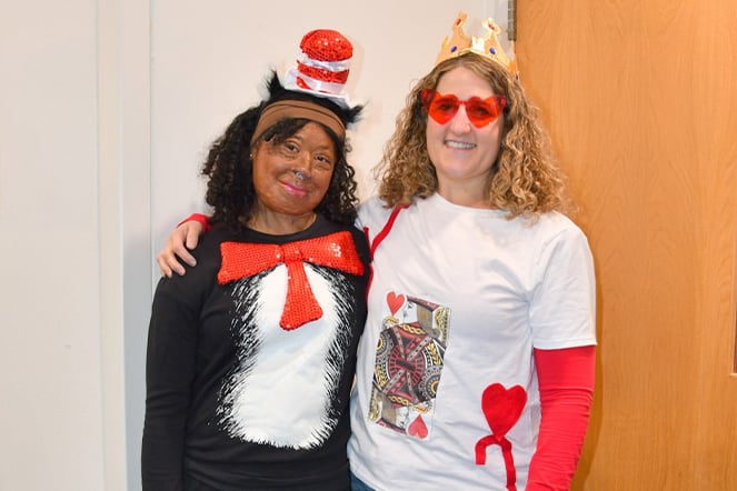 Michelle and her care manager, Liza Gamelli, LICSW, CCM, are both dressed up to celebrate Halloween at Shriners Children's Boston.